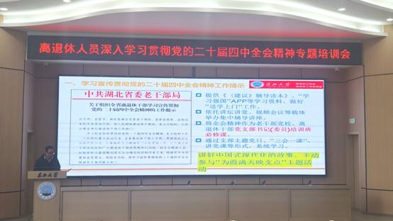 离退处党委书记肖品龙以《学习贯彻党的二十届四中全会精神 落实相关工作部署 助推学校高质量发展》为题,从“学习党的二十届四中全会精神工作提示、老龄化国情教育指导意见、湖北省老年教育条例”三个方面传达上级文件精神,帮助离退休人员理清全会精神核心要义,把握实践要求,讲好中国式现代化的故事,积极参与“为霞满天映支点”活动。同时,传达了学校党支部集中换届工作的通知要求。