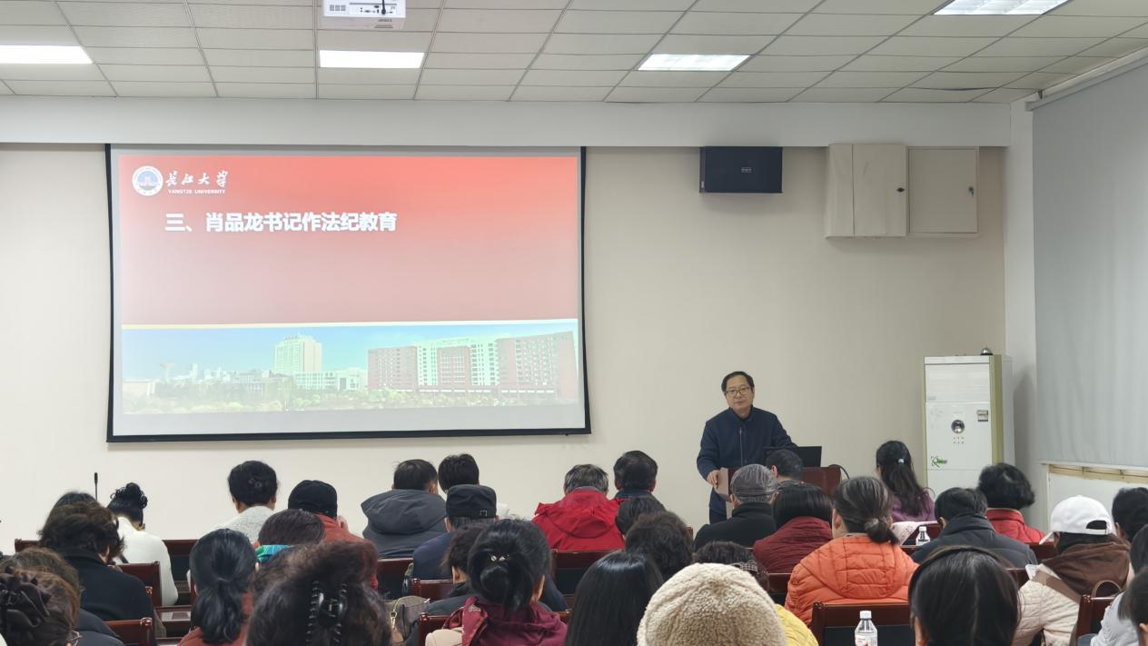 以案说纪,用身边事教育身边人。党委书记肖品龙传达了学校二届纪委六次全会精神、宣传了学校《关于从严从重处理酒驾醉驾等违规违纪行为的意见》的文件精神、通报学校2025年党风廉政建设情况及老同志酒驾、违规打牌等典型案例。