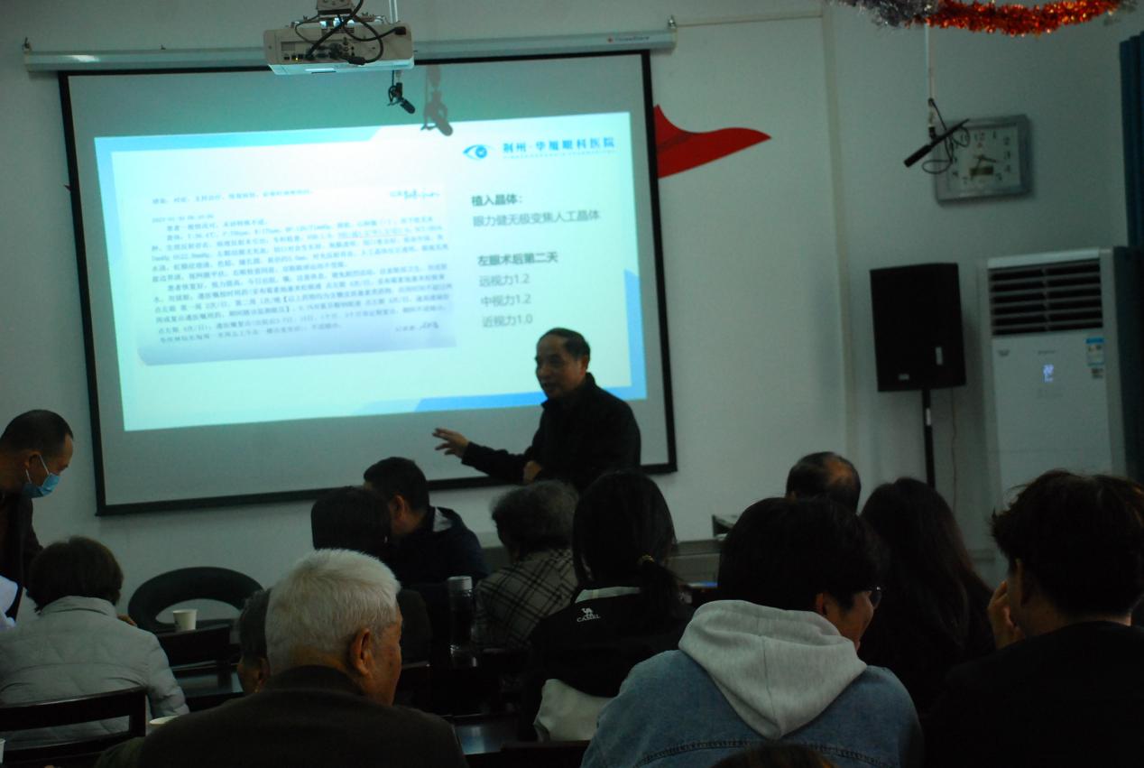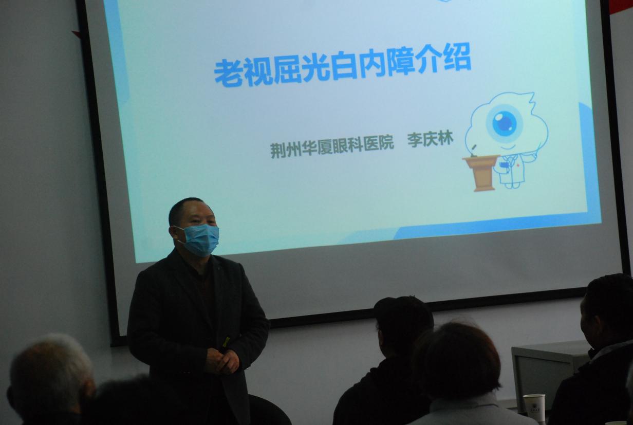 11月11日下午3:00,在西校区老年活动中心多功能室和舞蹈室内,一场主题为“老视屈光白内障介绍”的专题讲座正式拉开帷幕。本次活动特邀荆州华厦眼科医院业务院长、副教授李庆林担任主讲人。离退休工作处副处长朱行书、活动科科长曹蓉、西校区离退办全体工作人员、近50名离退休老同志和部分西校区学生参加了本次活动。